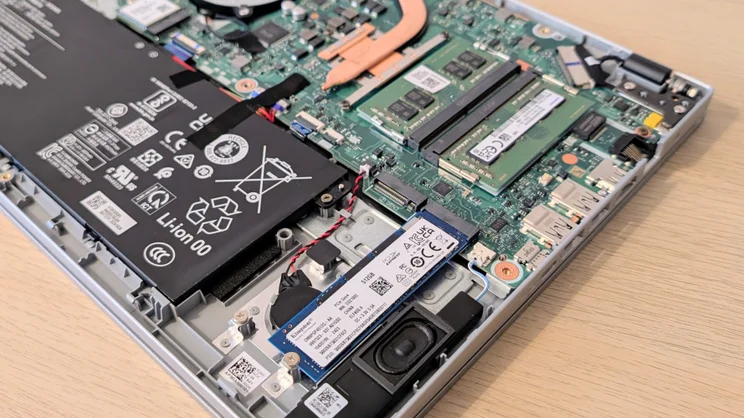 Remove the base plate from the Go 15, and you’ll get a genuine surprise. Not only can you upgrade the RAM in both the SODIMM mounts, but there’s space for a second 2280 SSD.