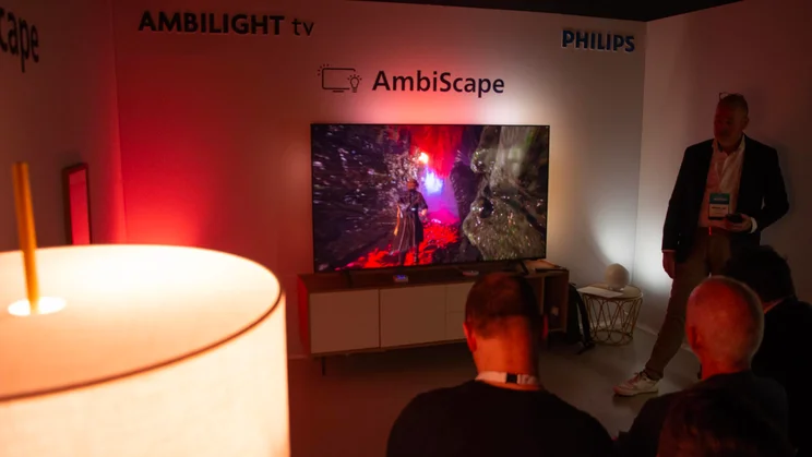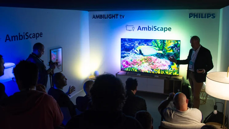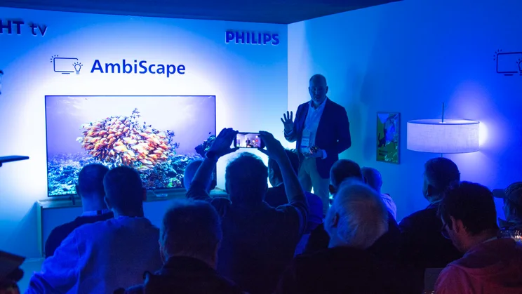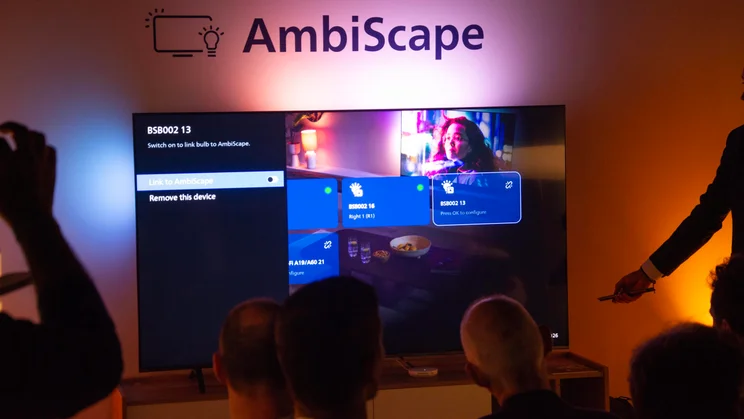 I got a demo of the technology at TP Vision’s Unboxed event in Berlin this week, and although I didn’t much enjoy being crammed into a small room with a bunch of other sweaty journos, the lighting experience was lit. The demonstration reflected how easily AmbiScape can be switched on via a hot key on the remote control of your TV or activated within the TV settings menu. Set up is nice and easy too, with connection to your external lights handled by an onscreen QR code and AmbiScape options available in the Philips Smart TV app.
