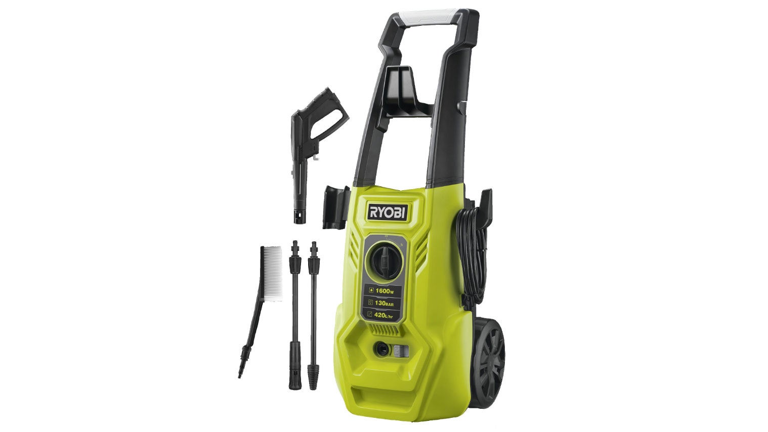 - Ryobi 130 (~£159) – Surprisingly powerful; Integrated detergent tank; Easily adjustable pressure on lance; Brush attachment included