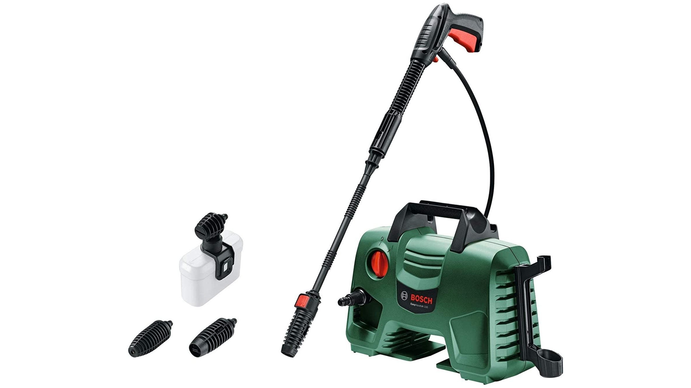 While it’s one of the cheapest models in Bosch’s EasyAquatak range, the EasyAquatak 110 has many positives. It’s a compact unit that looks a little like a mini suitcase, with the high-pressure pipe emerging from the back and the hosepipe connector at the front. It’s incredibly simple to set up and operate, with just a single rotary on/off switch at the front and a trigger and a lock on the handle; it’s pretty much point and shoot from there on in. It comes with three nozzles – an adjustable fan/jet nozzle, a high-power rotary nozzle and a detergent nozzle for cleaning foams and detergents.