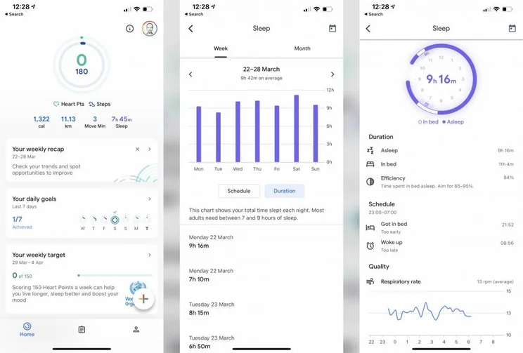 Once you’ve slept with the Nest Hub 2 next to your bed for a while, the data gathered appears in two places: either as a card on the Nest Hub’s display, which you can tap to drill into, or within the Google Fit app.