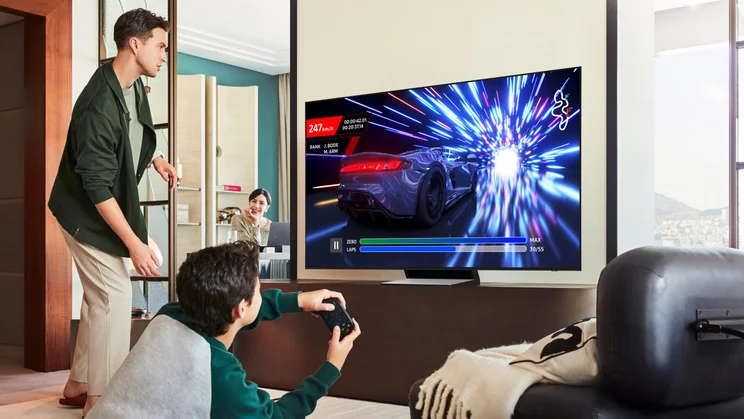 Gamers will love the S95F. All four of its HDMI ports support crucial current-gen features such as ALLM (Auto Low-Latency Mode) and VRR (Variable Refresh Rate), there’s support for AMD’s FreeSync Premium Pro, and Samsung’s Game Bar provides welcome options for gaming customisation. You’ve also got the Samsung Gaming Hub*, which functions as a one-stop shop for accessing games on services such as the Xbox app, Nvidia GeForce Now and Amazon Luna.